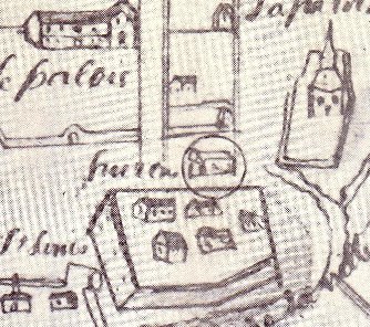 Encadrés en bleu, la réserve d'Ailleboust et le fort des Hurons selon le plan de Jean_Bourdon de 1660. A noter que la chapelle_Champlain se trouvait dans le fort des Hurons, sur son coté ouest.
