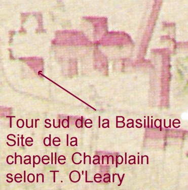 Ainsi, de la même façon que l'on retrouve plusieurs autels et chapelles consacrés dans l'actuelle basilique, il y en aurait eu deux dans l'église de Québec lors de cet incendie de 1640. Élucidant ainsi le problème toponymique contenu dans les archives relativement aux chapelles dites Champlain et du Gouverneur, il poursuit en localisant le site de Notre-Dame-de-Recouvrance et l'emplacement de la chapelle Champlain. Sa conclusion est catégorique: «je crois pouvoir indiquer avec une certaine précision que la tour de la basilique se trouve sur le terrain originalement occupé par la chapelle Champlain» .