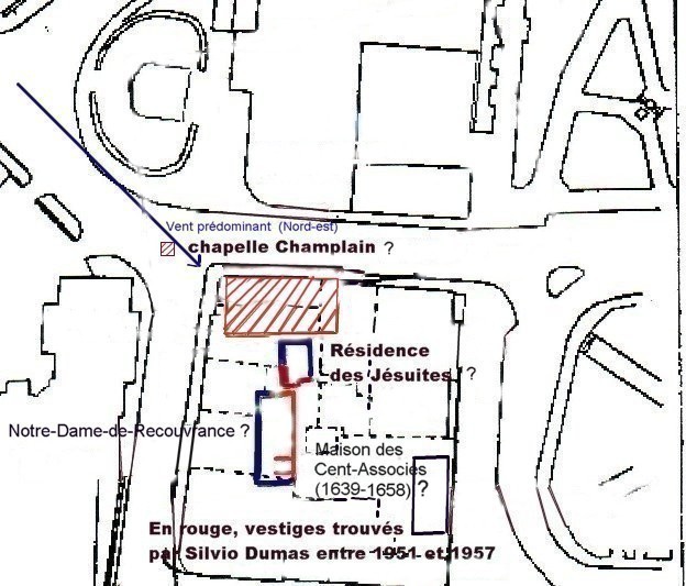 Le 14 juin 1640, trois bâtiments en bois de sapin sont incendiés. Le feu s'est sans doute propagé suite à des vents prédominants nord-est (voir ligne bleu). Les bâtisses se trouveraient peut-être dans le même axe et sans doute qu'elles étaient séparées par un faible espace. George Larouche (1988) mentionne que les constructions étaient adjacentes mais non contiguës. Ainsi la chapelle_Champlain serait peut être située près de la résidence des Jésuites. Niellon (1990) mentionne qu'après cet incendie, la maison des Cent-Associés, épargnée par le feu, servira d'église paroissiale jusqu'en 1650. Quant aux Jésuites, ils y résident entre 1640 et 1650 (4).