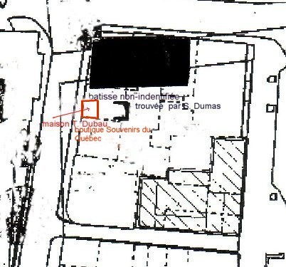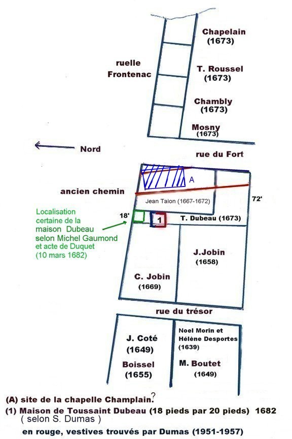 Cette situation dégage simultanément un corridor qui sera accordé à Toussainct Dubeau. Dans ce corridor énigmatique, Silvio Dumas identifie par erreur, la maison de Toussainct Dubeau (trait rouge sur le plan). En 1673, Toussainct Dubeau reçoit le dernier lot de la réserve d'Ailleboust. Bien que la moitié de la réserve fût cédée à la Fabrique de Québec le 20 mai 1656 par le gouverneur Lauzon, l'Hôtel-Dieu baille à Dubeau un lot qu'il dit lui appartenir, selon les volontés de la Madame d'Ailleboust. Le différend fut réglé à l'amiable par une vente conjointe. (6)