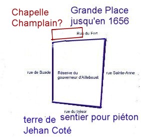 Dans la description du terrain de Talon, la chapelle_Champlain n'est plus mentionnée comme borne comme on retrouve dans l'acte de vente de Mathieu Huboust. Cela se comprend étant donné le déplacement vers l'est du terrain.