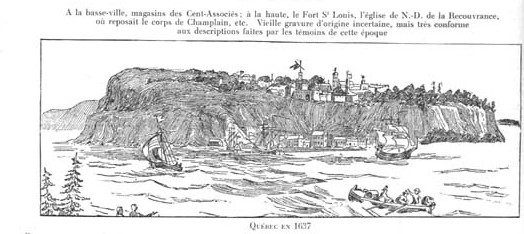 Le 29 mars 1632, le Traité de Saint-Germain-en-Laye restitue à la France le Canada et l'Acadie. En 1633, la Compagnie des Cent-Associés reprend possession de la Nouvelle-France. Champlain érige alors sur les terres de la Compagnie, la chapelle Notre-Dame-de-Recouvrance pour respecter le voeu qu'il avait fait si le Canada revenait à la France. En 1635, les Jésuites occupent une résidence servant de presbytère à l'église paroissiale. Lorsque Champlain meurt en décembre 1635, celui-ci est placé dans la crypte de la chapelle Notre-Dame-de-Recouvrance. (2) En printemps 1636, on érige un "sépulchre particulier" tout près.